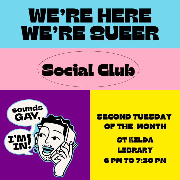 This club runs monthly on every second Tuesday at The St Kilda Library. It provides a safe, vibrant space to be yourself and connect with fellow LGBTIQA+ adults. Come as you are, bring a friend (or make a new one!) and enjoy an evening of fun, laughter and connection in a safe, supportive and welcoming space full of colour, joy and pride!