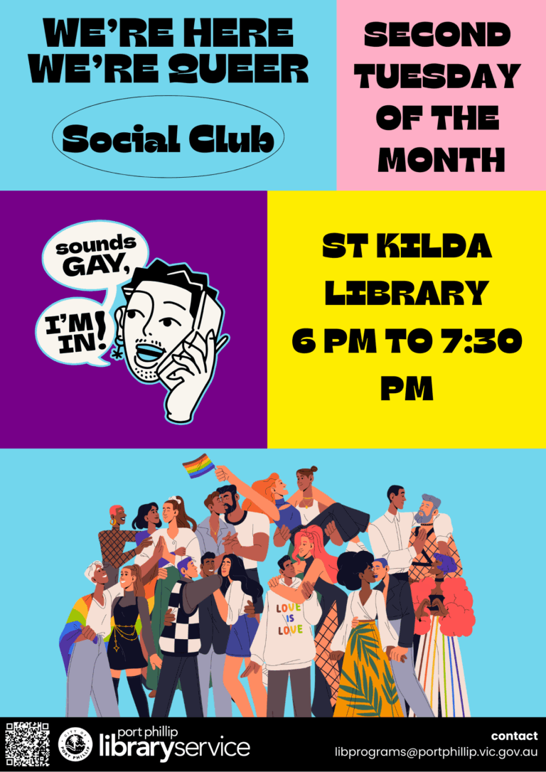 This club runs on the second Tuesday of the month at The St Kilda Library. It provides a safe, vibrant space to be yourself and connect with fellow LGBTIQA+ adults. Come as you are, bring a friend (or make a new one!) and enjoy an evening of fun, laughter and connection in a safe, supportive and welcoming space full of colour, joy and pride!