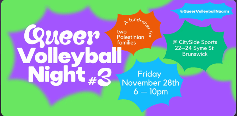A friendly, all-skill level (beginners super welcome!) indoor rebound beach volleyball tournament. All profits raised from tickets will be donated to the families of two young Palestinians Abdullah and Yara. On arrival, you will be placed into randomised teams of 5-6 players and play friendly games lasting 10 minutes each, and get breaks throughout the night to mingle and eat/drink/be merry! Open practice courts are open from 6 for warmup and games start from 7pm, until 10pm. Players are free to stay as long or little as they want.